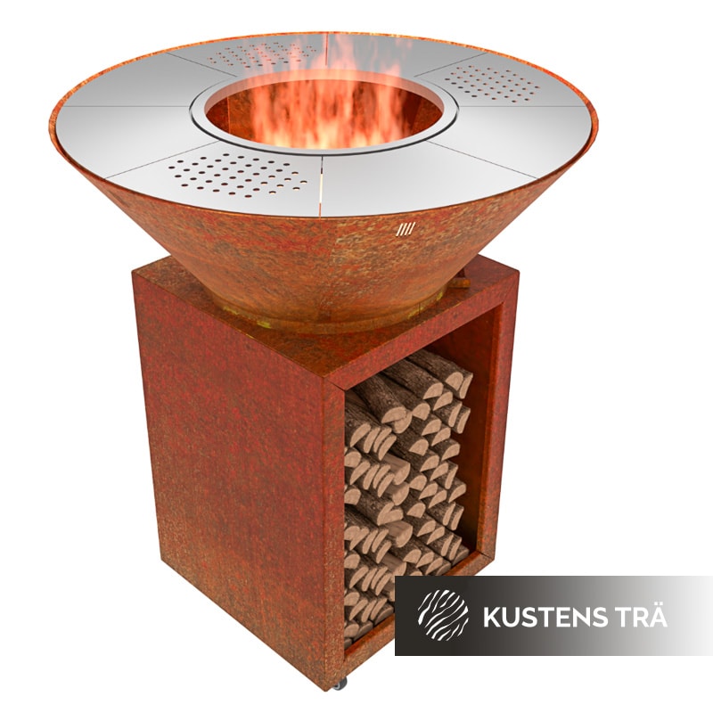 Exklusiv eldstad/grill från Cortenbolaget i cortenstål med vedförråd.