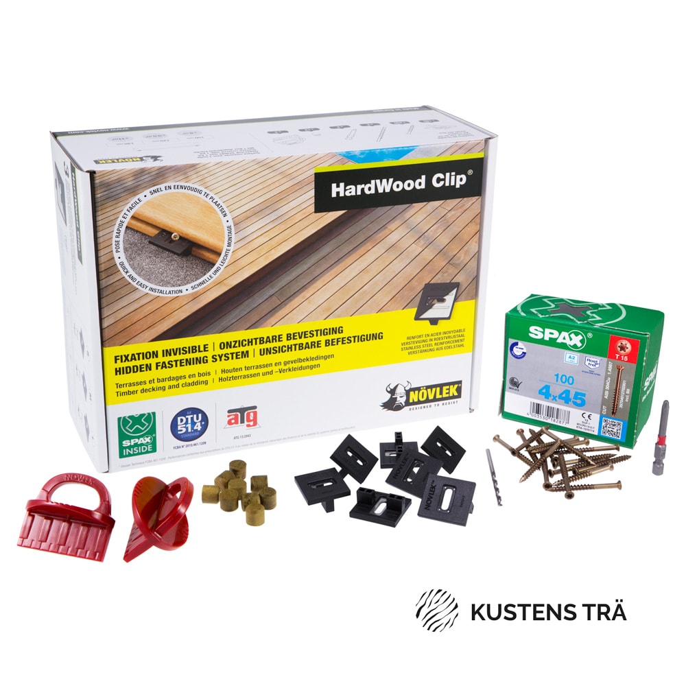 Fästsystemen ger med sina osynliga infästningar ett trädäck där trallbrädorna behåller sitt ursprungliga och vackra utseende utan spår från skruvskallar. Samtidigt gör fästsystemets förmåga att ta upp och styra trämaterialets rörelser ett slutresultat som blir mycket hållbart och stabilt. Növlek Hardwood Clip® har integrerade distanser som ger ett jämnt mellanrum vid installationstillfället, och skruvens patenterade SPAX®-profil ger precision och hållfasthet vid infästningspunkterna med minimal flisning.