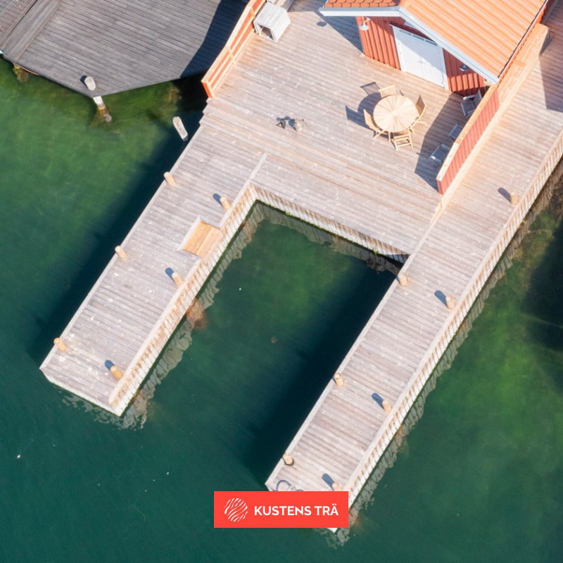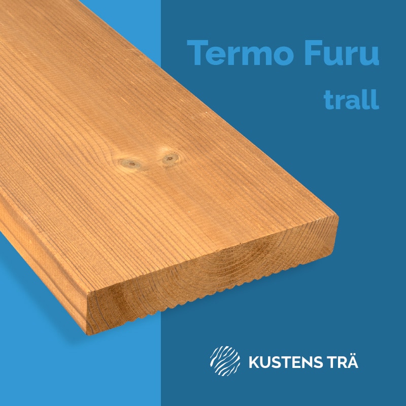 Termotrall i värmebehandlad Furu är ett miljövänligt alternativ som har en hög motståndskraft mot röta på grund av den värmebehandling trämaterialet har gått igenom. En fördel med allt värmebehandlat trä är att det, om du lämnar det utan ytbehandling, snabbt ändrar färg och till slut får en vackert grå patina. Perfekt när du vill att trädäcket skall smälta in i omgivningen.